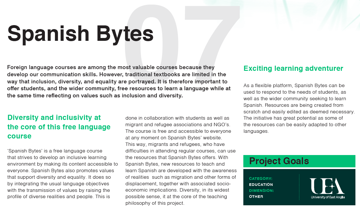 Spanish Bytes also seeks to foreground values that support diversity and equality. Thus, the content will aim to integrate the usual language objectives with the transmission of values. It will do this by raising the profile of diverse realities and peoples. This is done in collaboration with support groups of migrants and refugees in Spain, like Atalaya Intercultural and Adra. Nonetheless, inclusiveness also means that students also play a part with their contributions. We would like to make space to as many voices as possible. Get in touch if you would like to collaborate with this project!